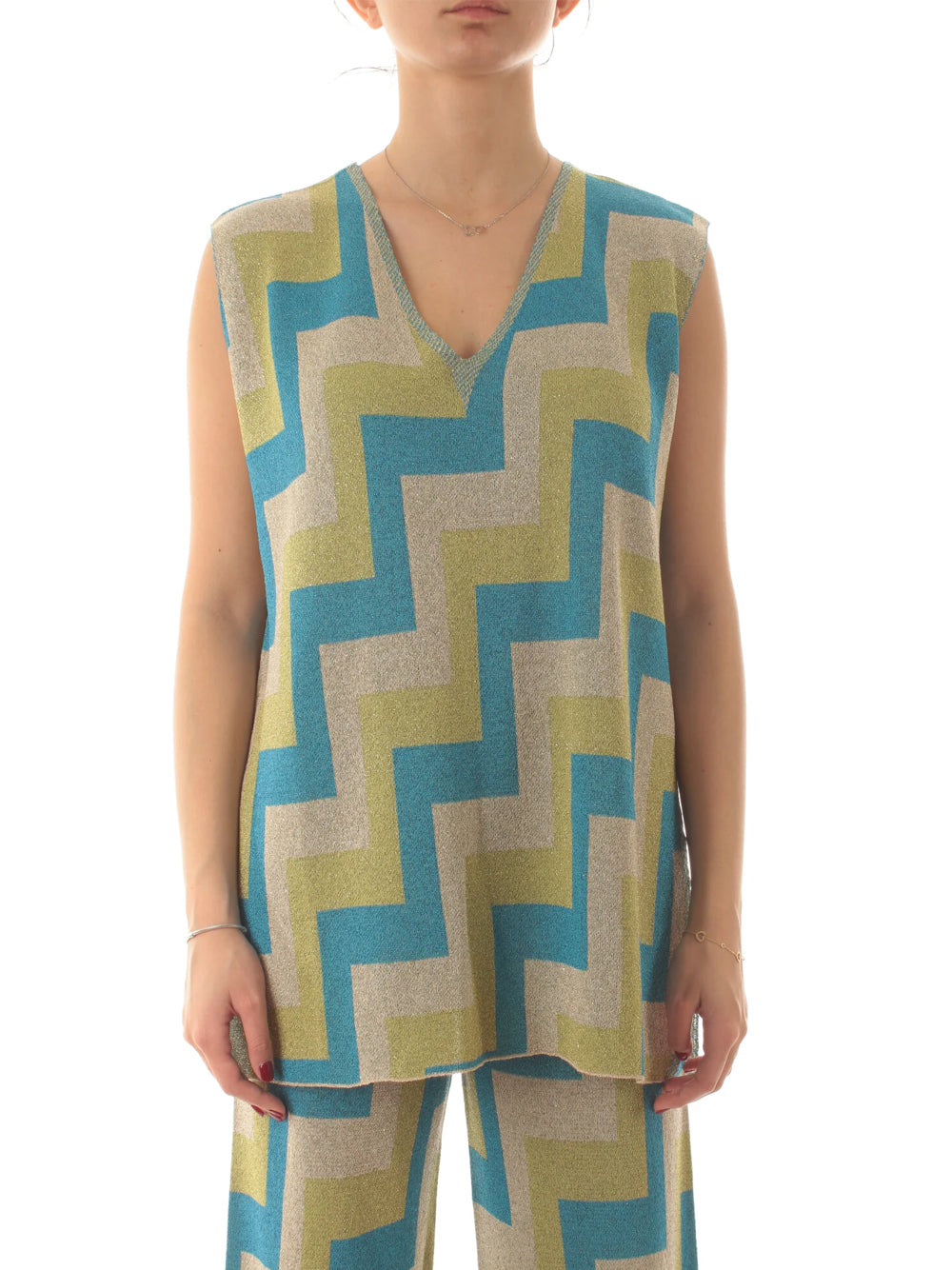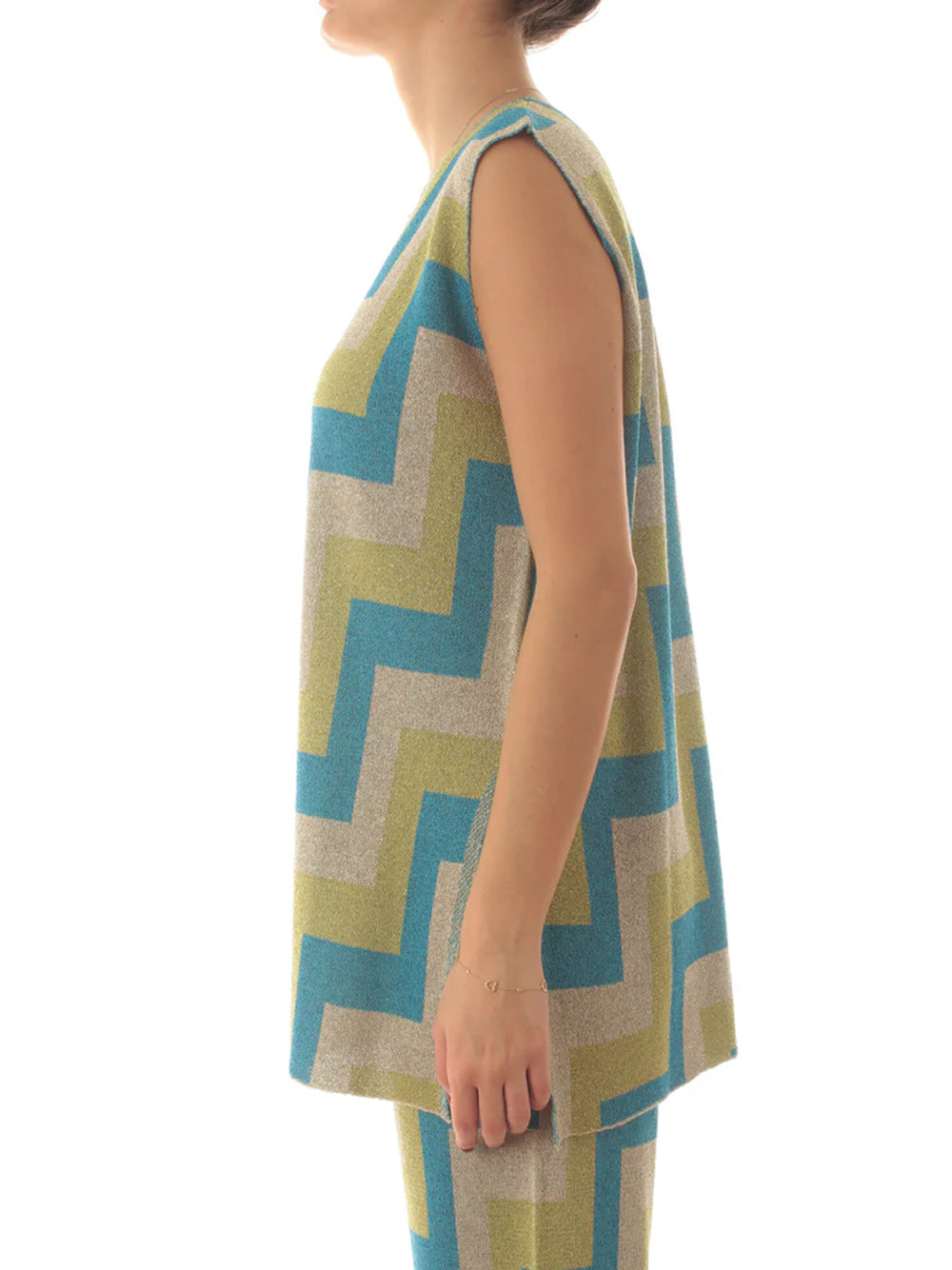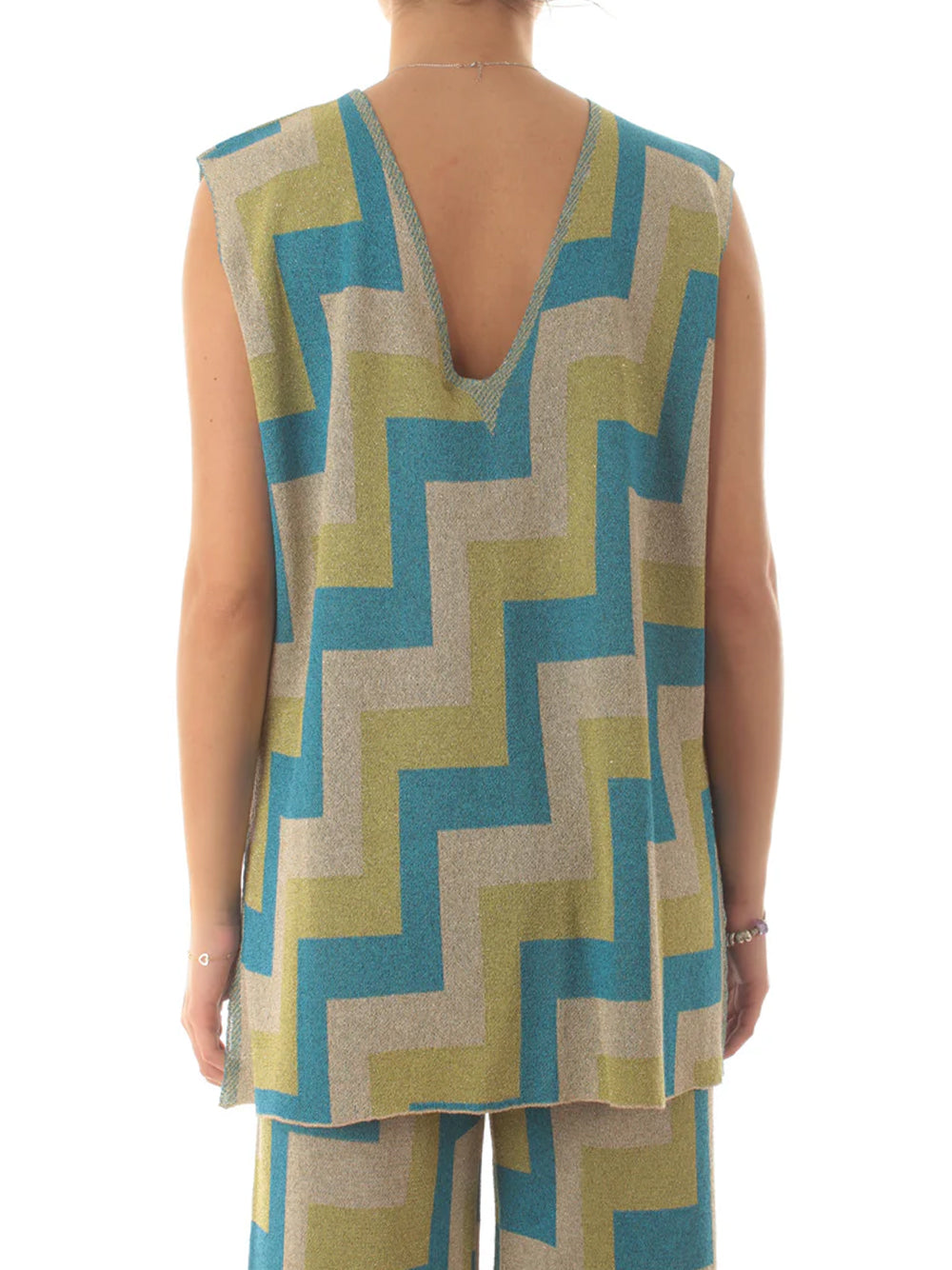 Maxi canotta in maglia con lurex e motivo a zig-zag. Scollo a V e spalline larghe.