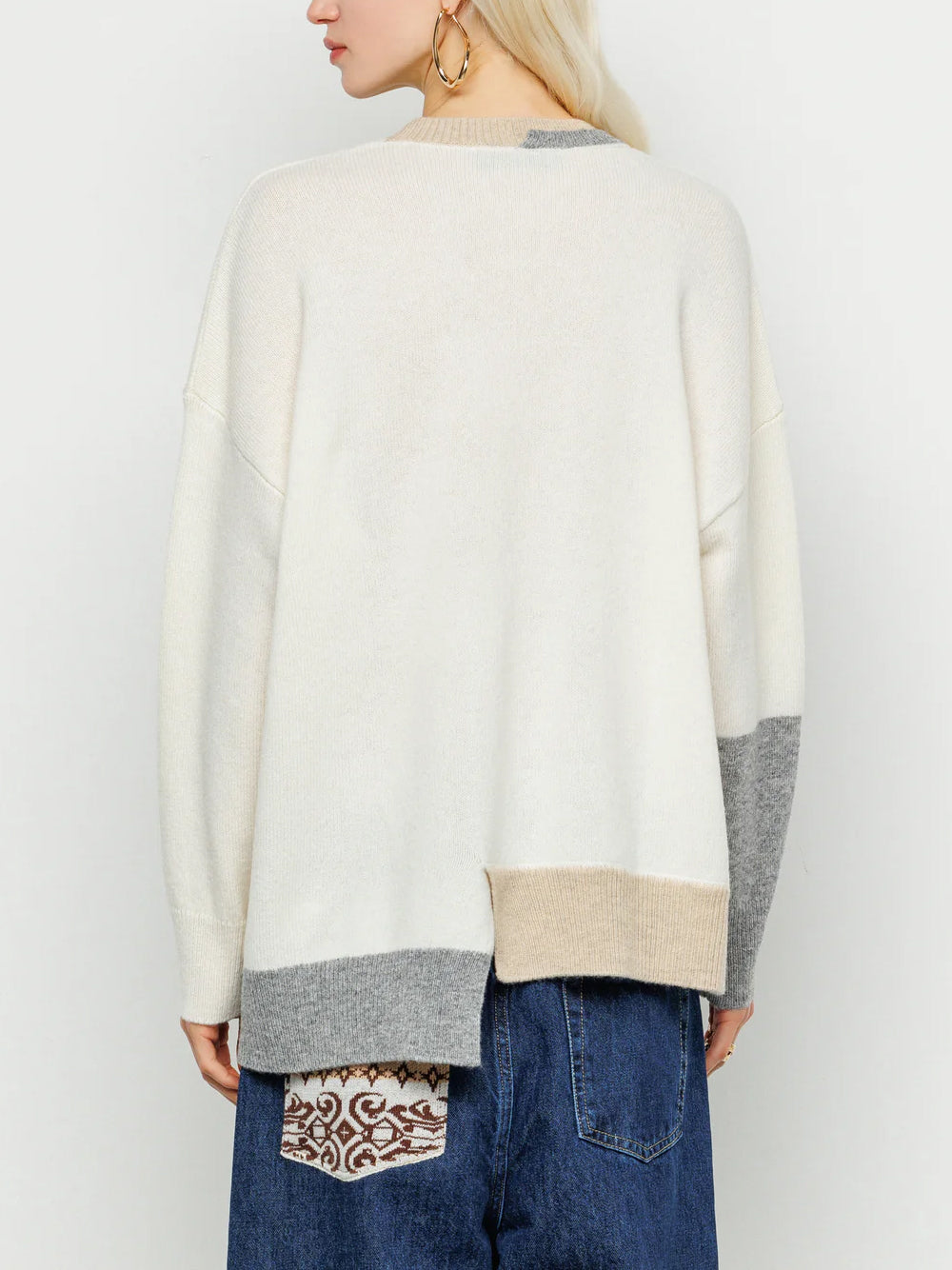 Morbido maglione a girocollo, con orlo sul fondo asimmetrico e dai colori a contrasto.