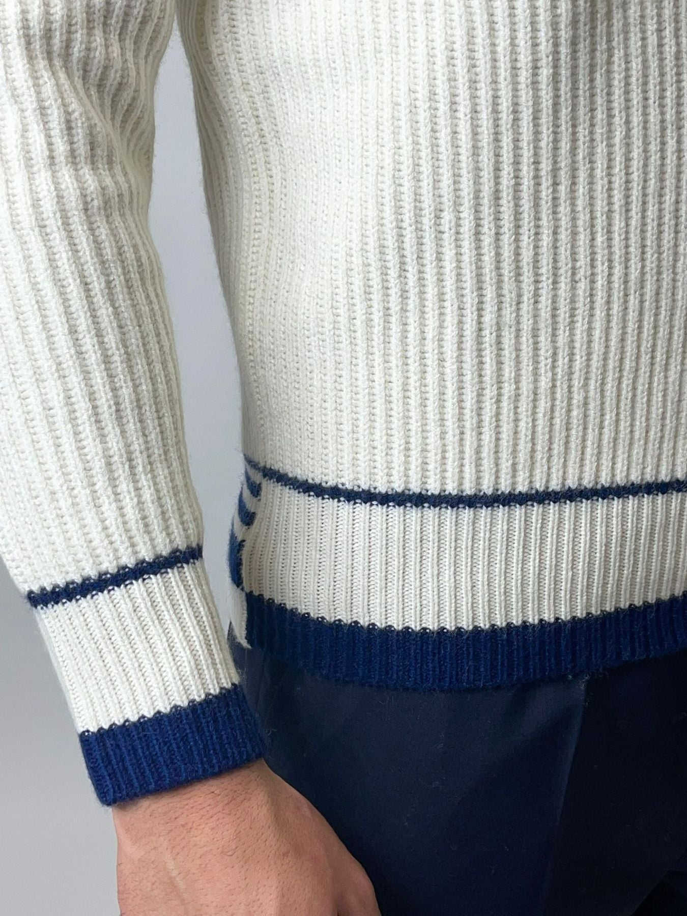 Cardigan in cashmere blend con bottoni e con dettagli contrasto colore blu sul fondo.