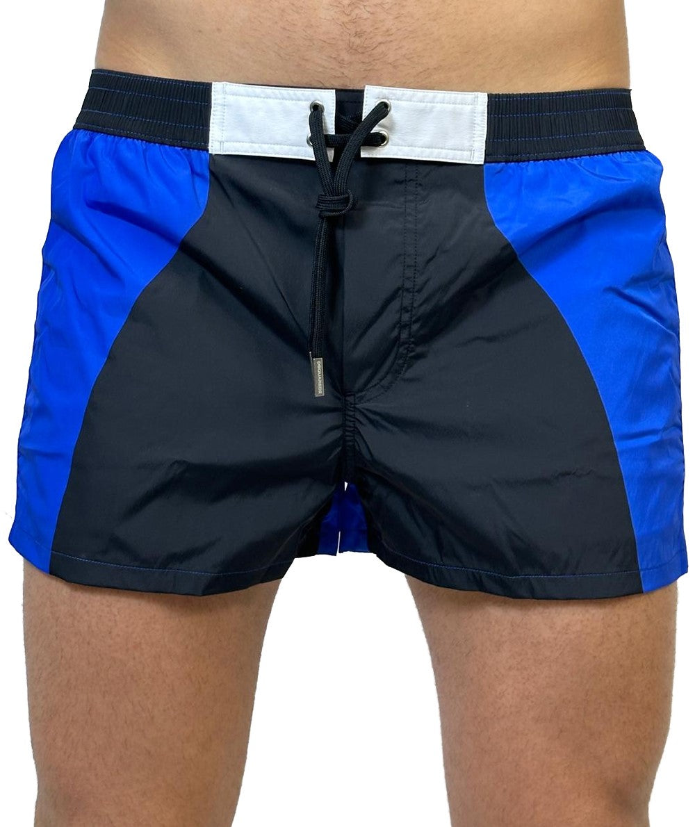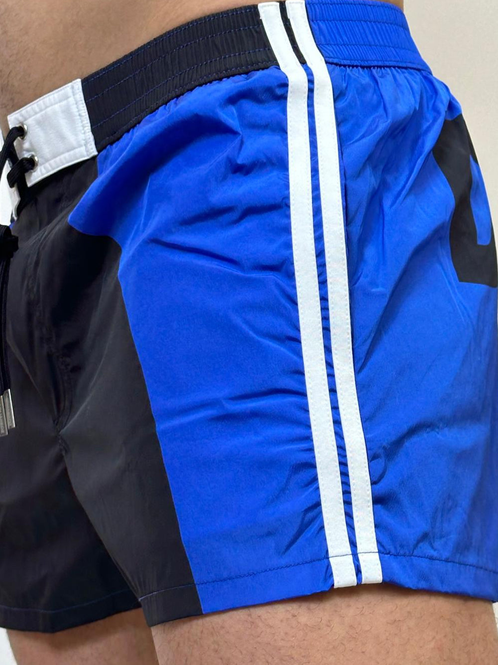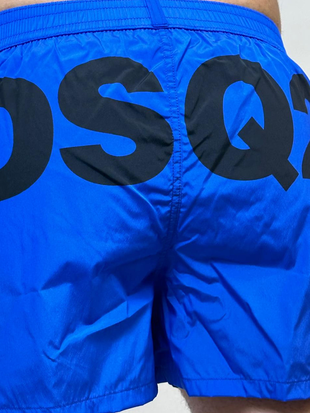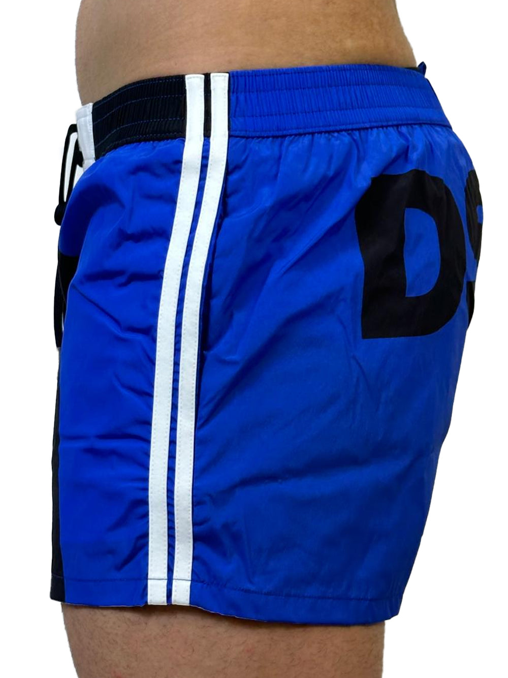 Boxer midi da bagno Dsquared2 con logo grande sul retro. Pannelli a contrasto con laccetti. Bordi laterali a contrasto.