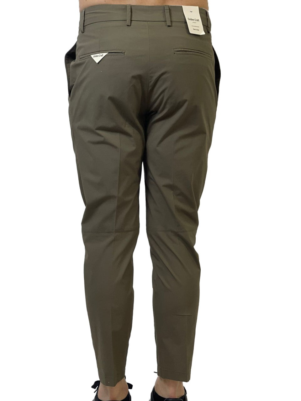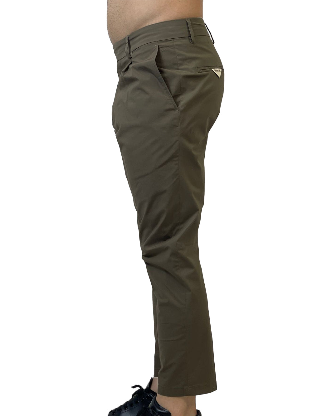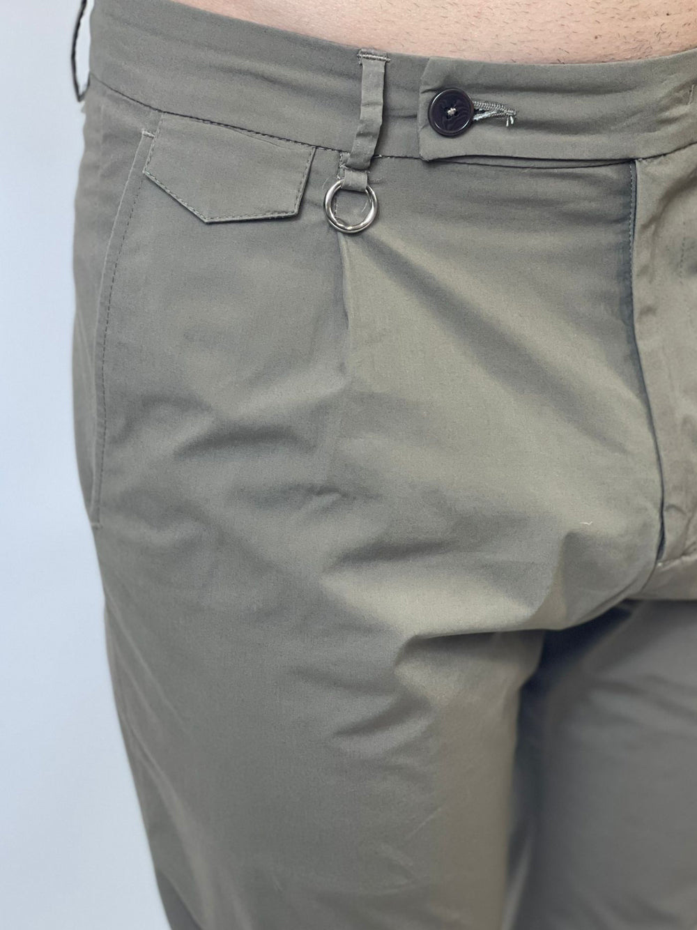 Pantalone 100% cotone con chiusura zip e bottone laterale. Passanti per cintura.