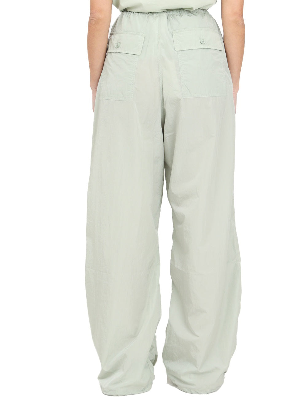 Pantaloni da donna in nylon a vita alta verde aloe. Chiusura con bottone logato con zip e coulisse con cordino, Tasche laterali e sul retro con bottone, Elastico Sul Fondo, stampa laterale.