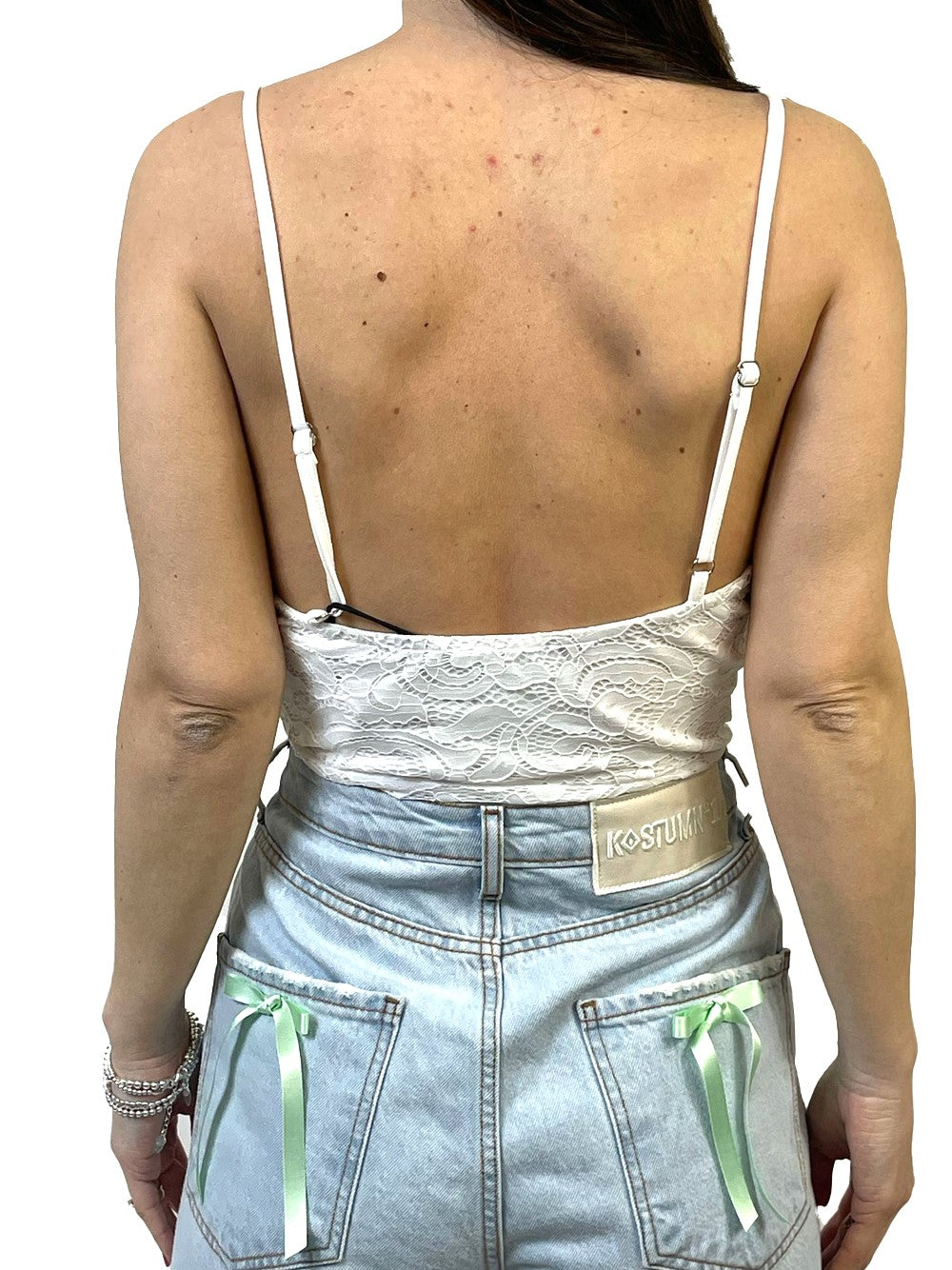 Corpetto a body in pizzo con bretelline. Chiusura con gancetti sul fondo.