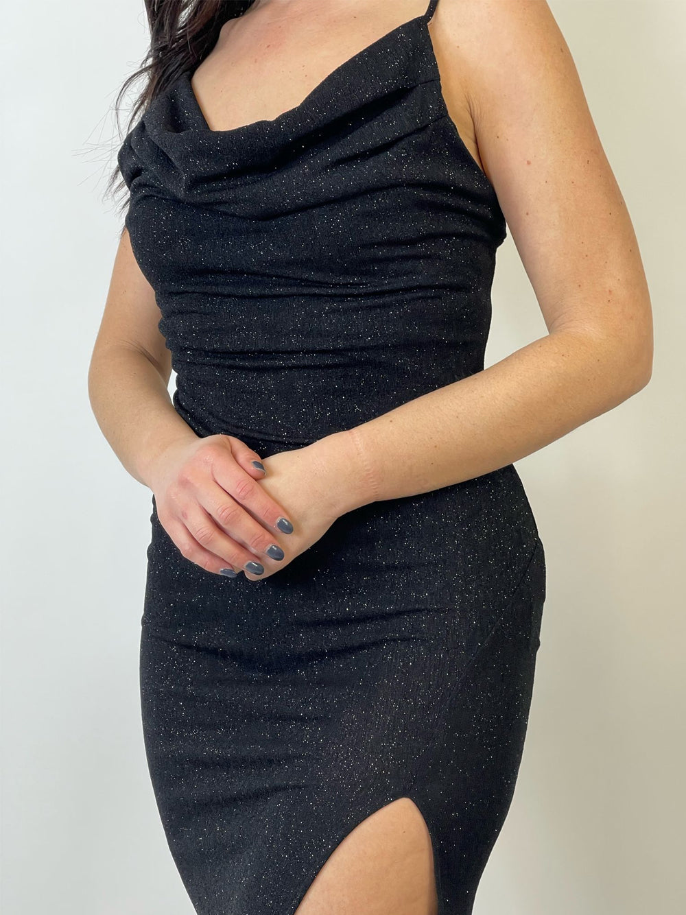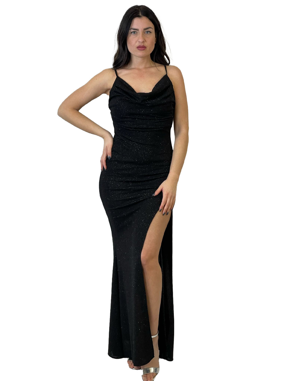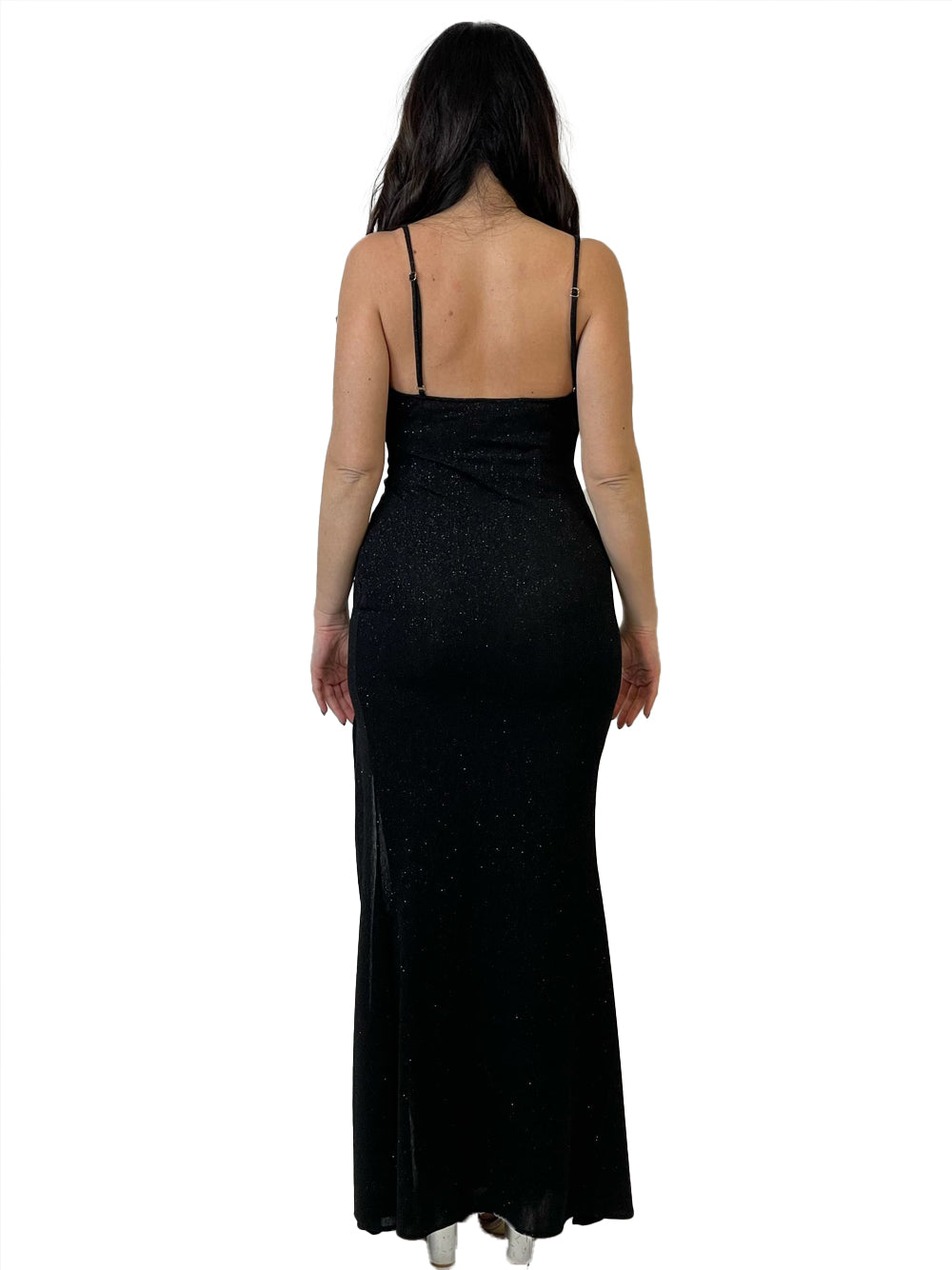 Abito lungo in maglia glitter nero a bretelline. Spacco laterale. Interno foderato.