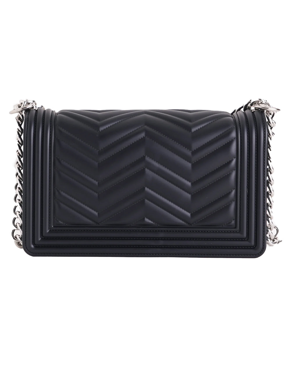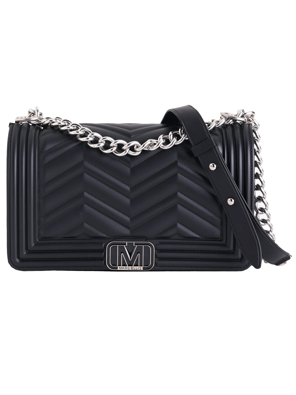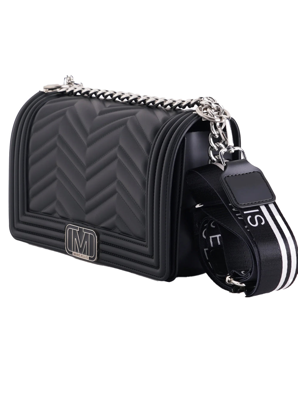 Borsa in pvc modello Wave taglia M con logo in metallo. Chiusura con patta magnetica. Tracolla a catena e in stoffa logata removibile e regolabile. Dimensioni: 25 x 15 x 8 cm.
