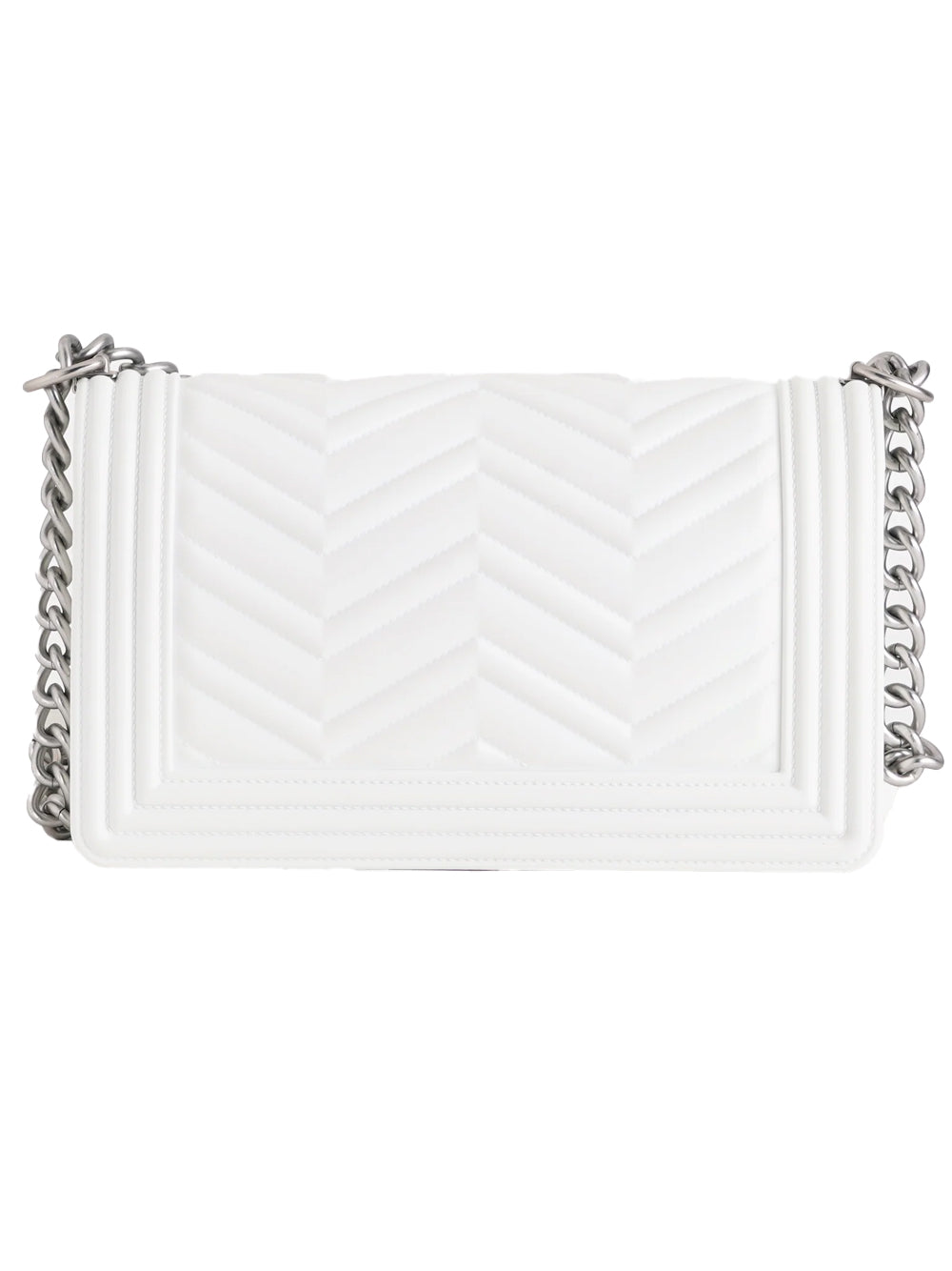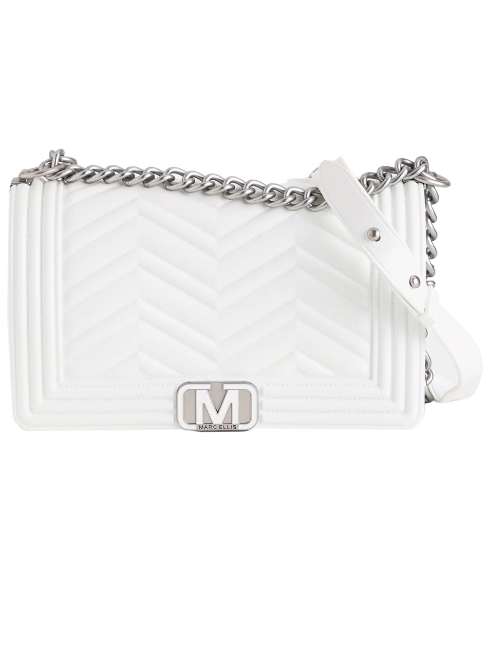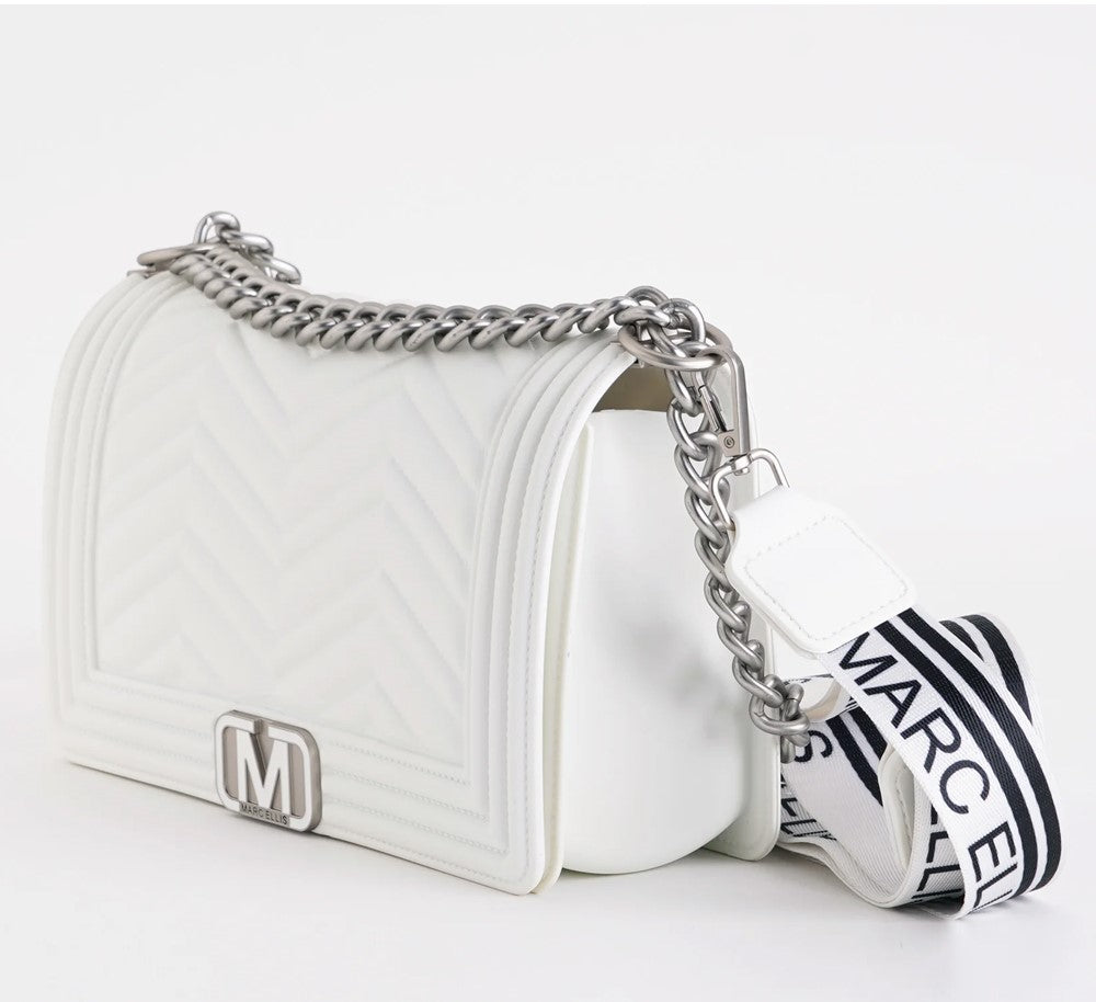 Borsa in pvc modello Wave taglia M con logo in metallo. Chiusura con patta magnetica. Tracolla a catena e in stoffa logata removibile e regolabile. Dimensioni: 25 x 15 x 8 cm.