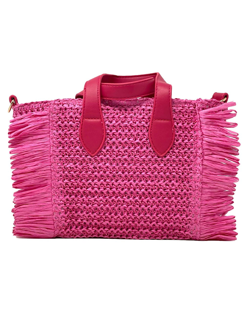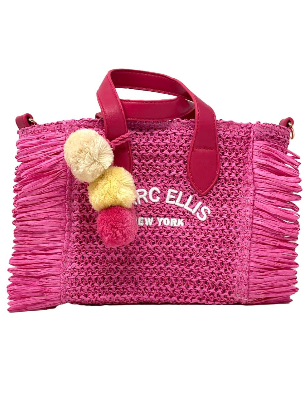 Borsa mare a mano in finta rafia con chiusura e tracolla interna. Colori a contrasto e pompon.