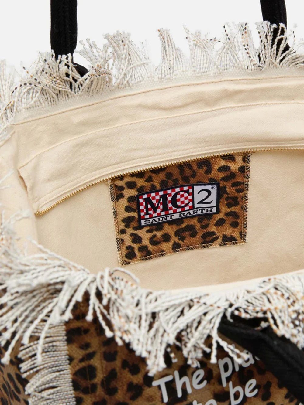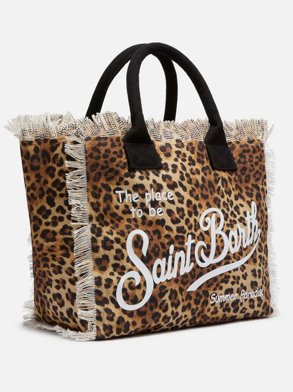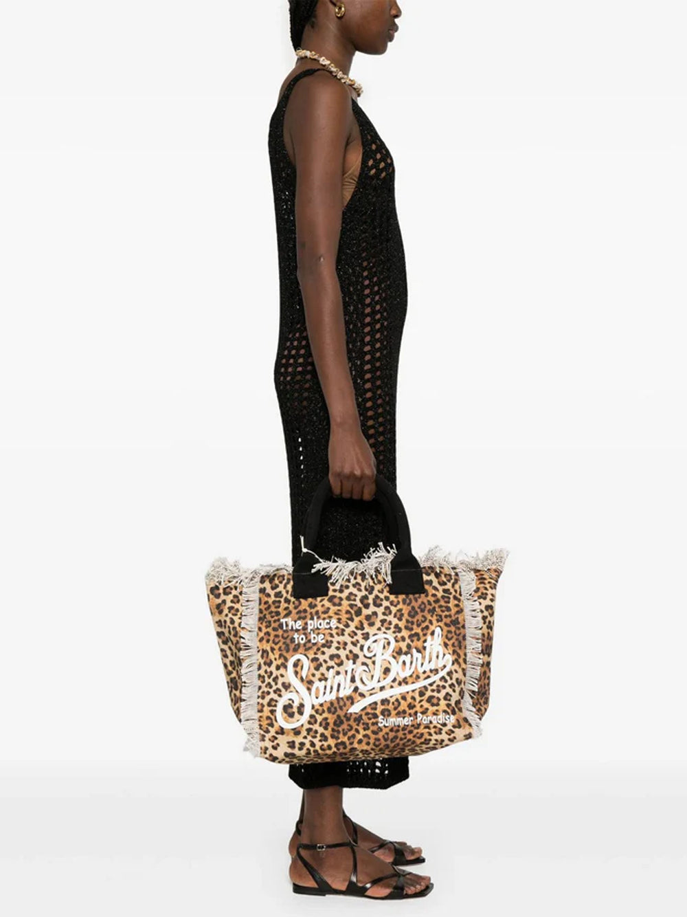 Borsa modello Vanity in tela di cotone con frange, da utilizzare in spiaggia e nel tempo libero. Base maculata, ricamo St. Barth a contrasto, patta interna con zip in metallo, tasca interna con zip.