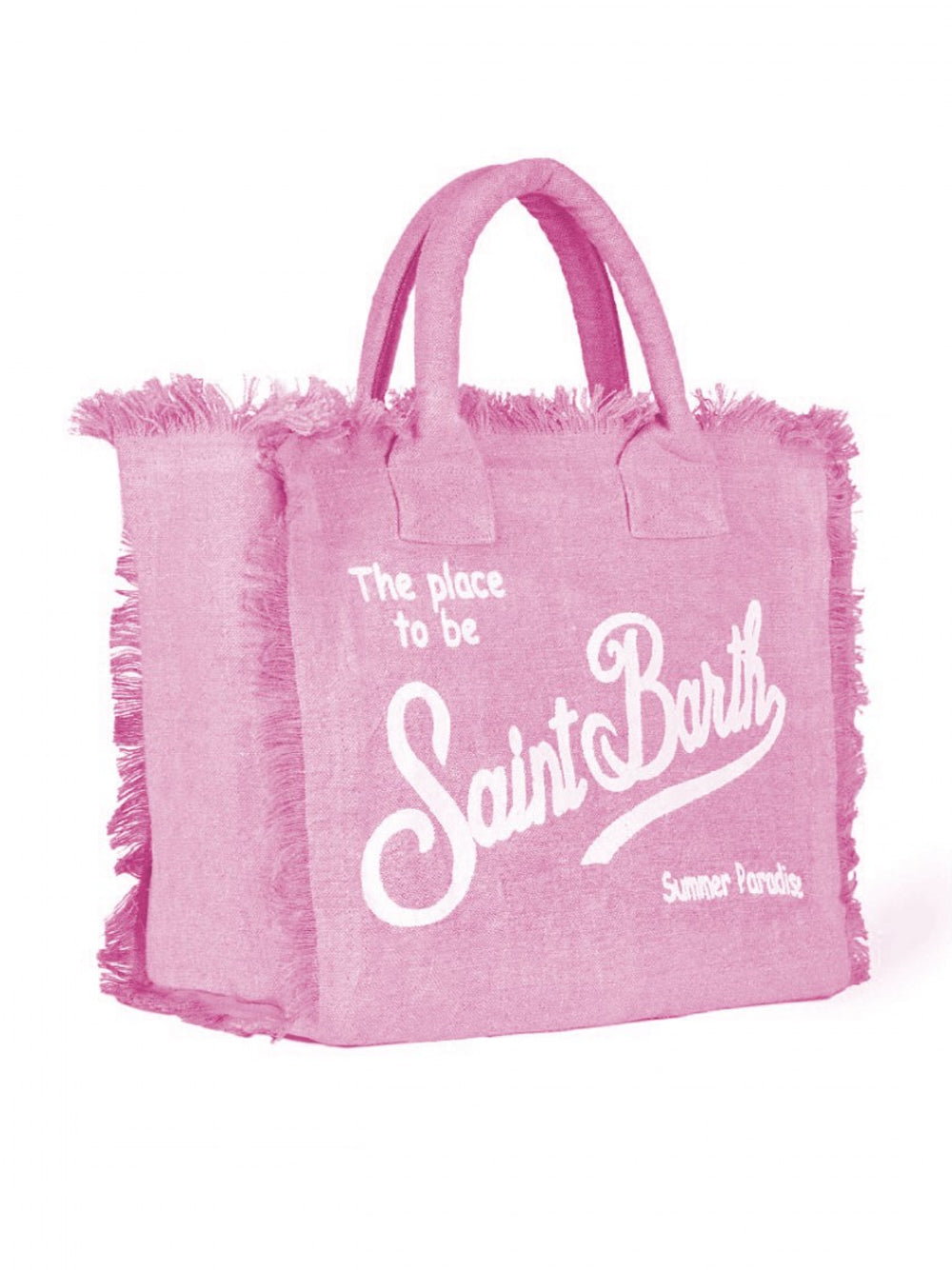 Borsa Mc2 Saint Barth modello Vanity realizzata in lino con frange su base rosa tinta unita e logo stampato bianco.