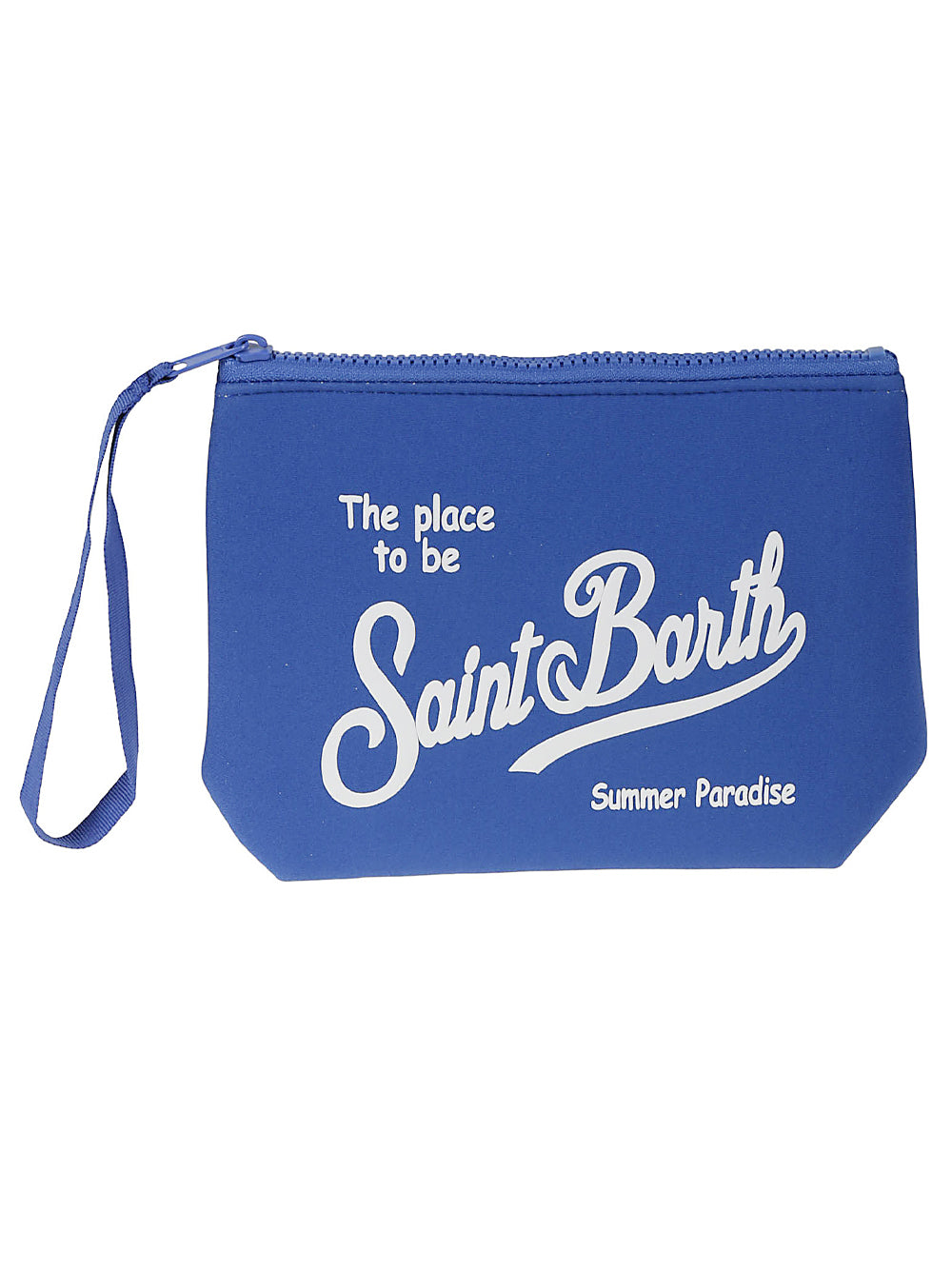 Pochette in scuba tinta unita, logo stampato Saint Barth, chiusura superiore con zip e pratica linguetta. Dimensioni: 20 x 14,5 x 7 cm.