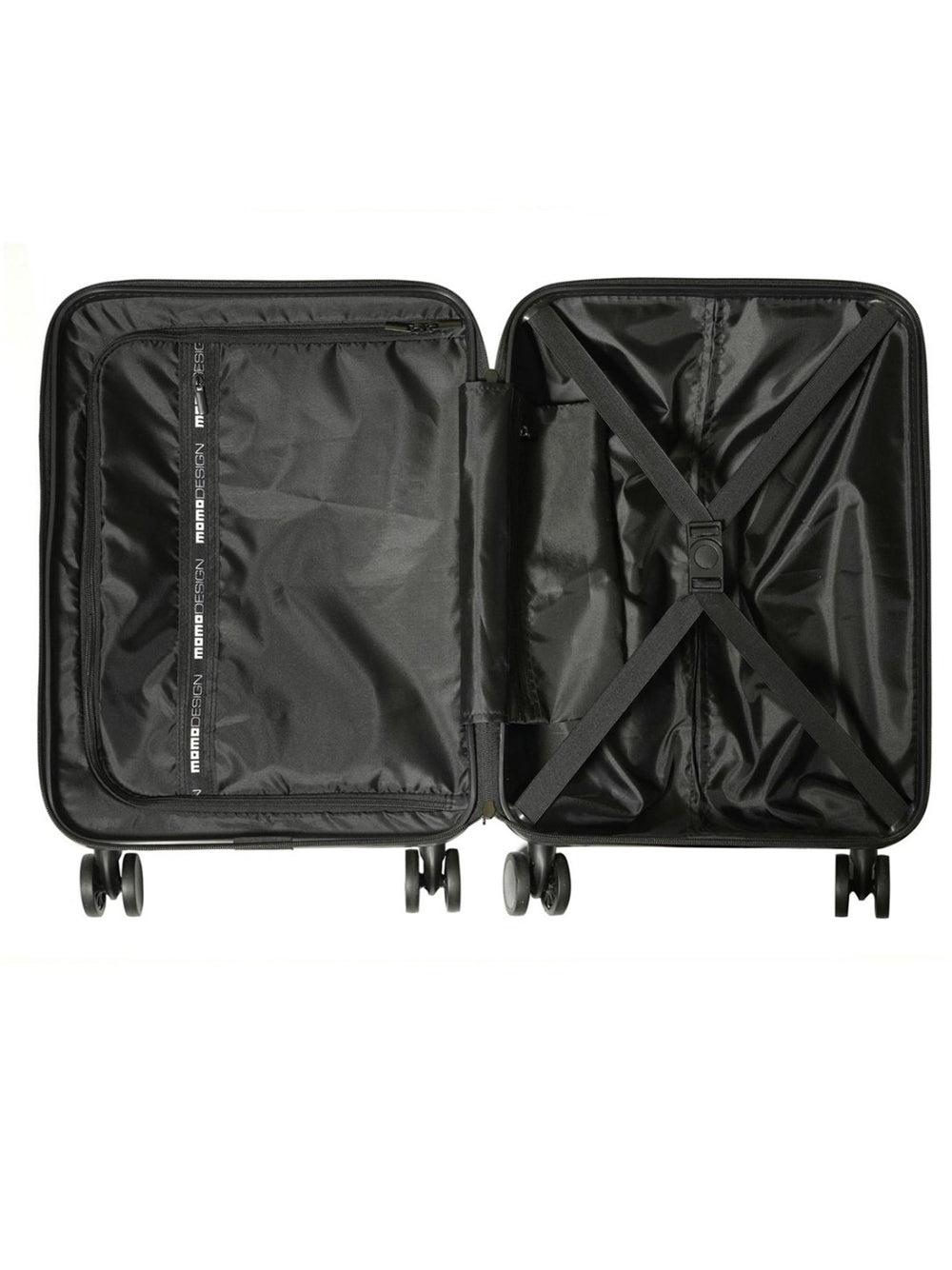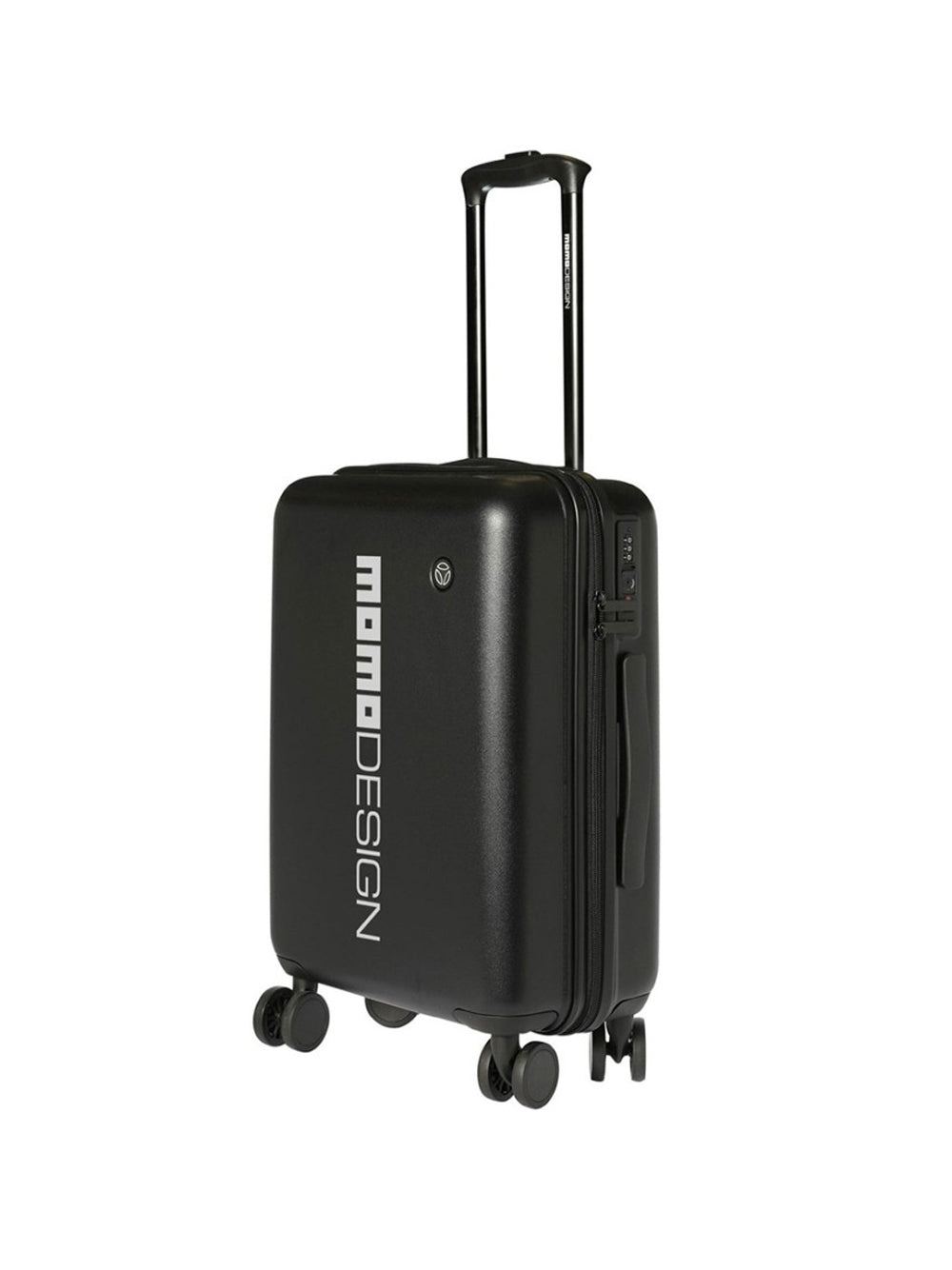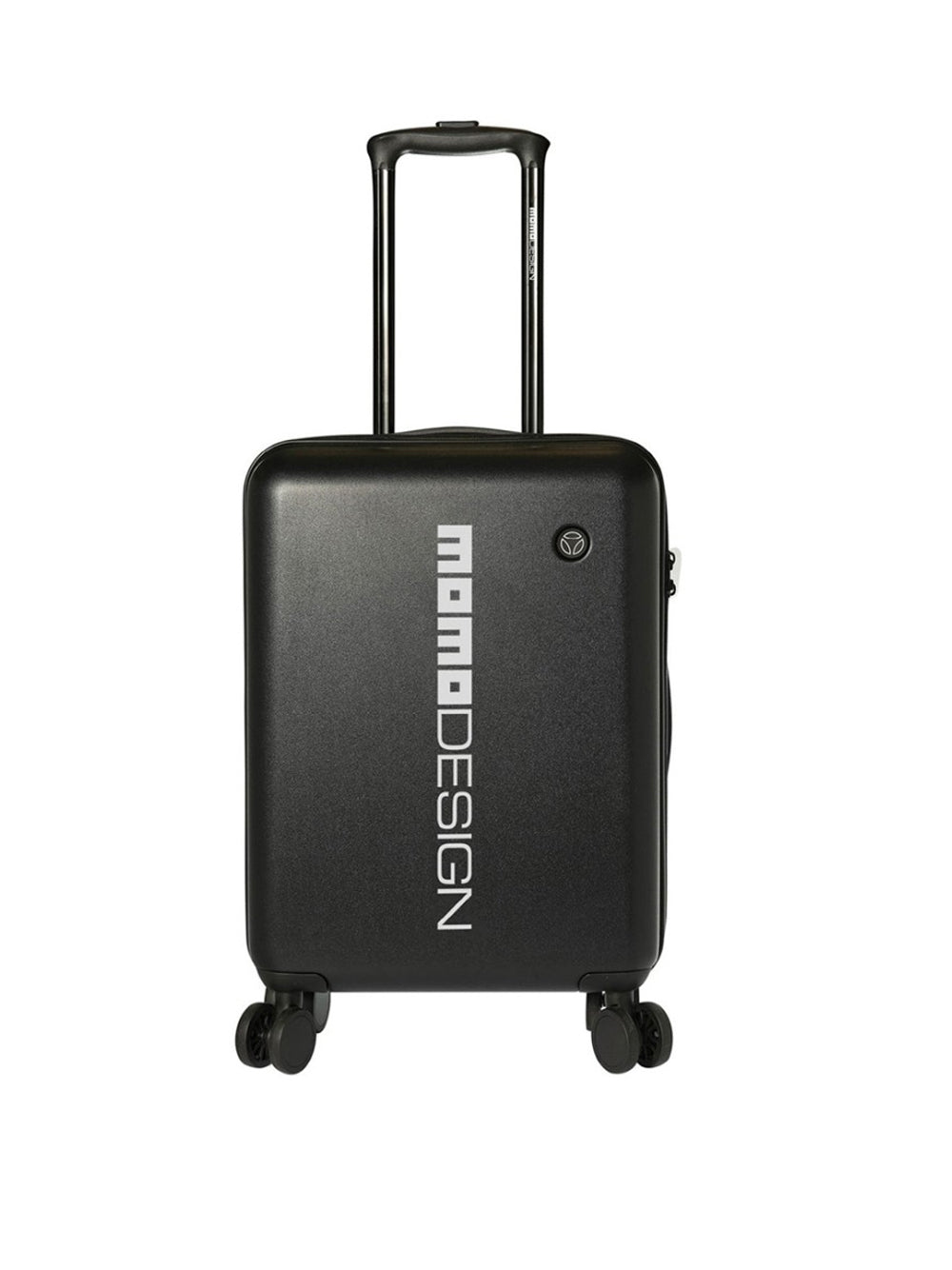Trolley piccolo in ABS nero con finitura opaca e decalcomania "Momo Design" sul davanti a contrasto. Chiusura con doppia zip e combinazione a 3 cifre. Manico in tpu, manico telescopico in alluminio e tpu. Dimensioni: 55 x 38 x 20 cm. Peso a vuoto: 2,5 Kg.