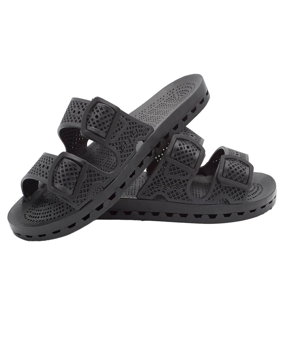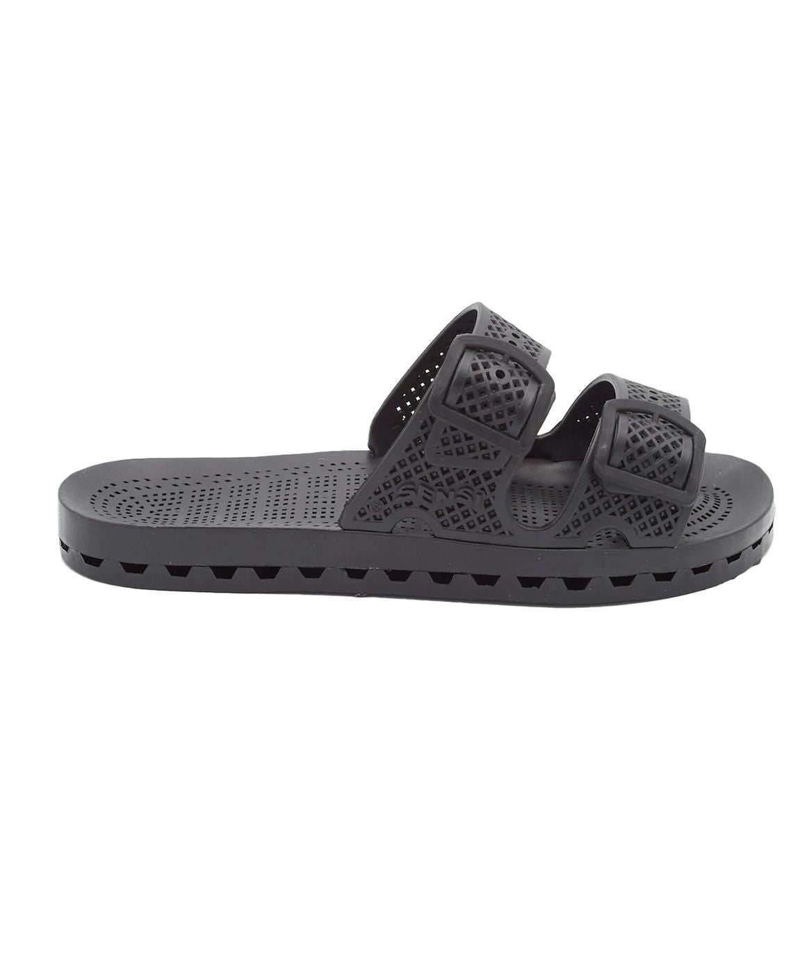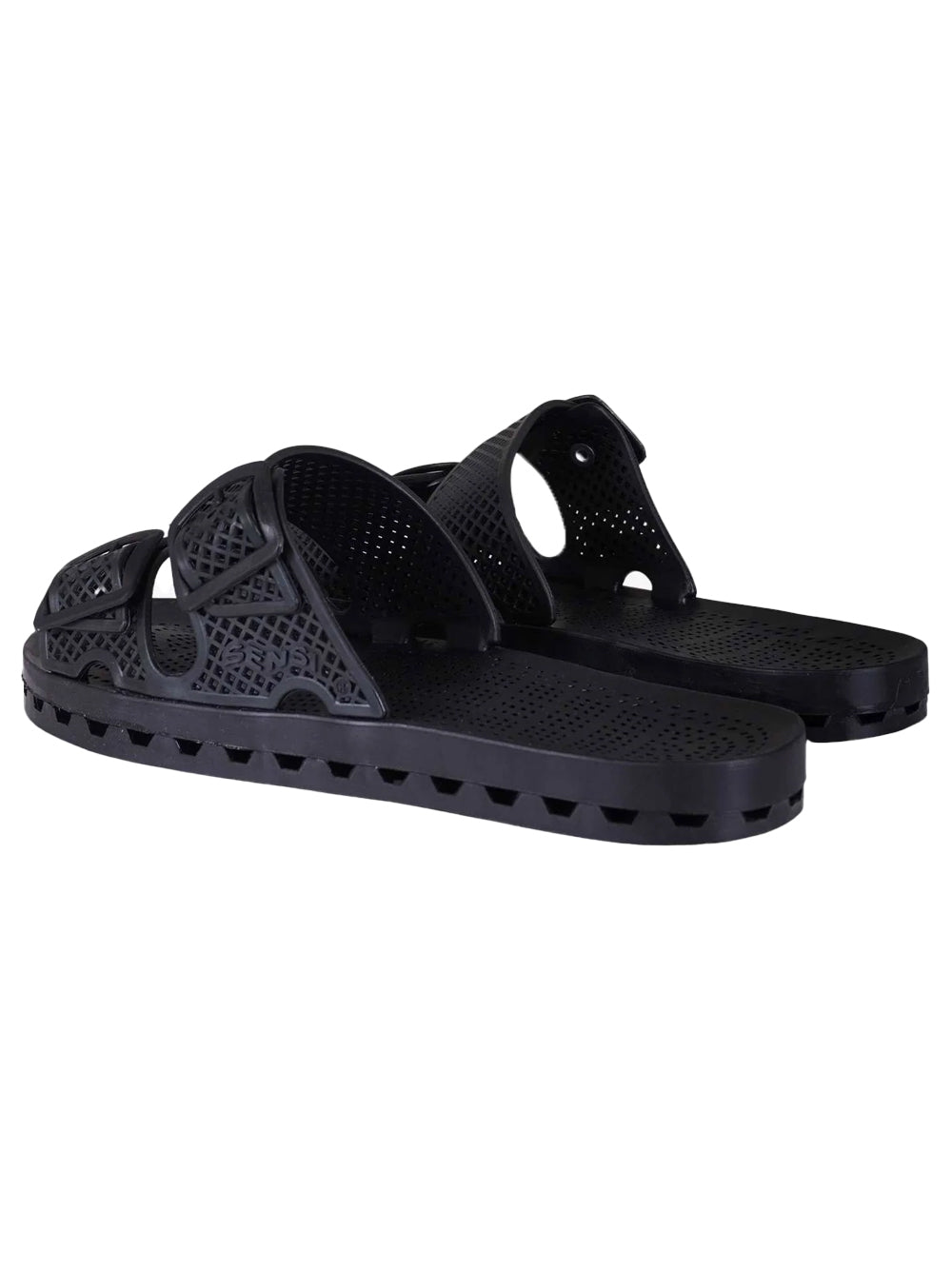 Ciabatte Sensi La Jolla urban nero con doppia fascia realizzata in gomma traforata, regolabile da fibbie. Sottopiede in gomma. Altezza 2 cm.