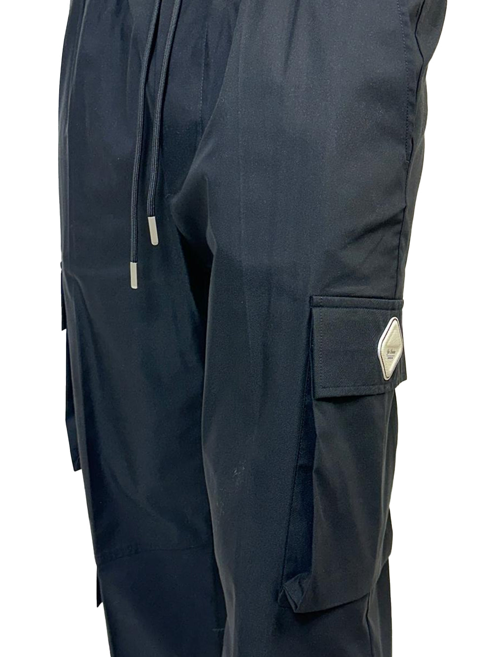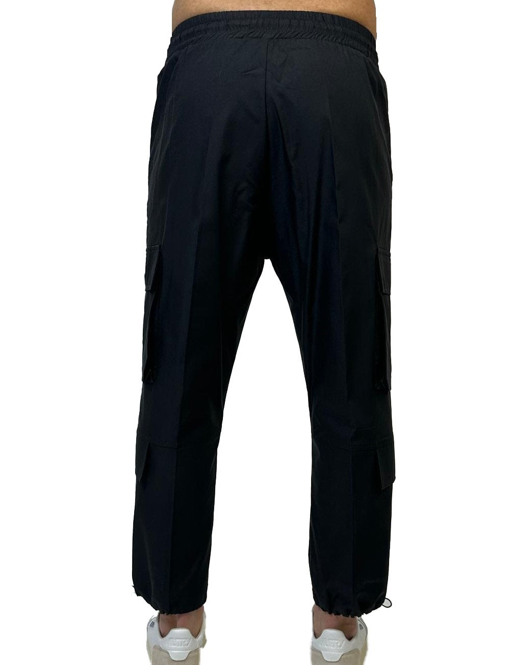 Pantacargo con vita elasticizzata e coulisse. Tasconi con rombo logo. Laccetti regolabili sul fondo.