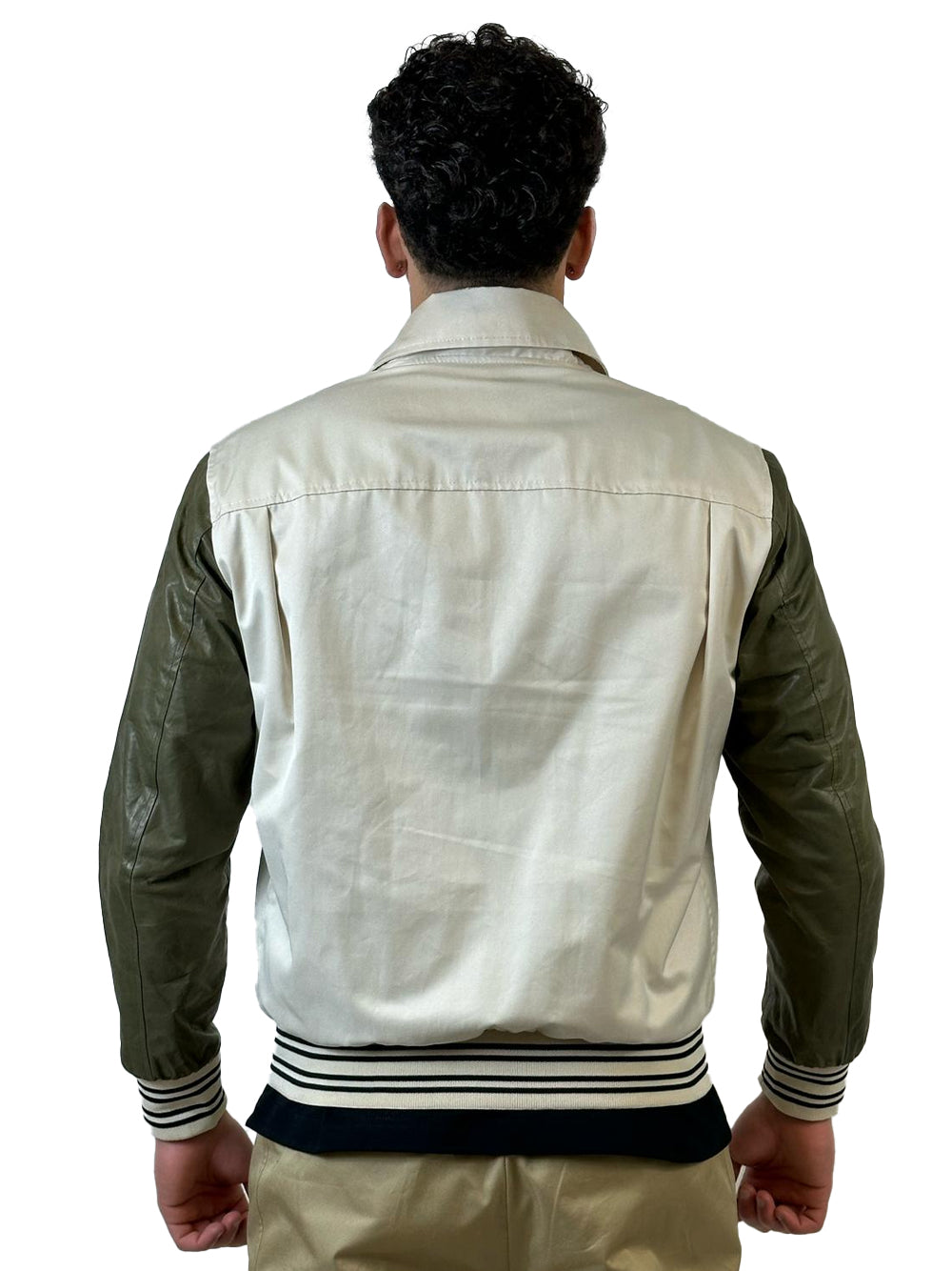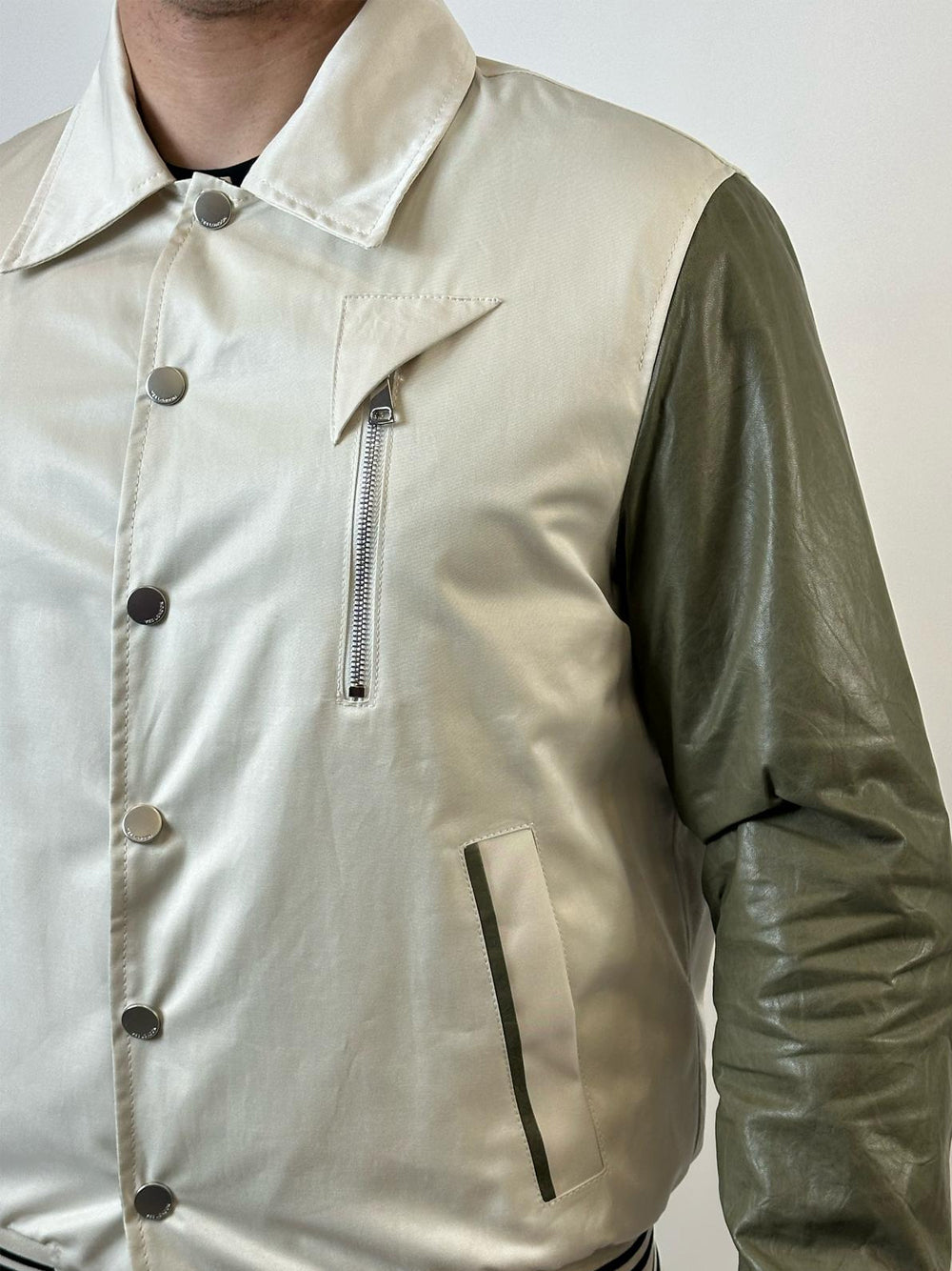 Giubbino con manica in pelle a contrasto effetto stropicciato. Chiusura con bottoni. Tasche aperte frontali. Fondo e polsini elasticizzati.