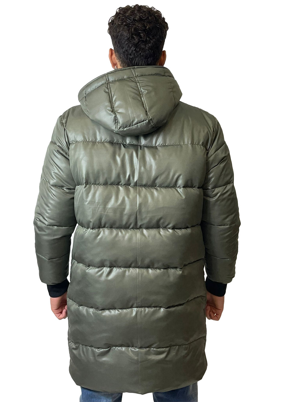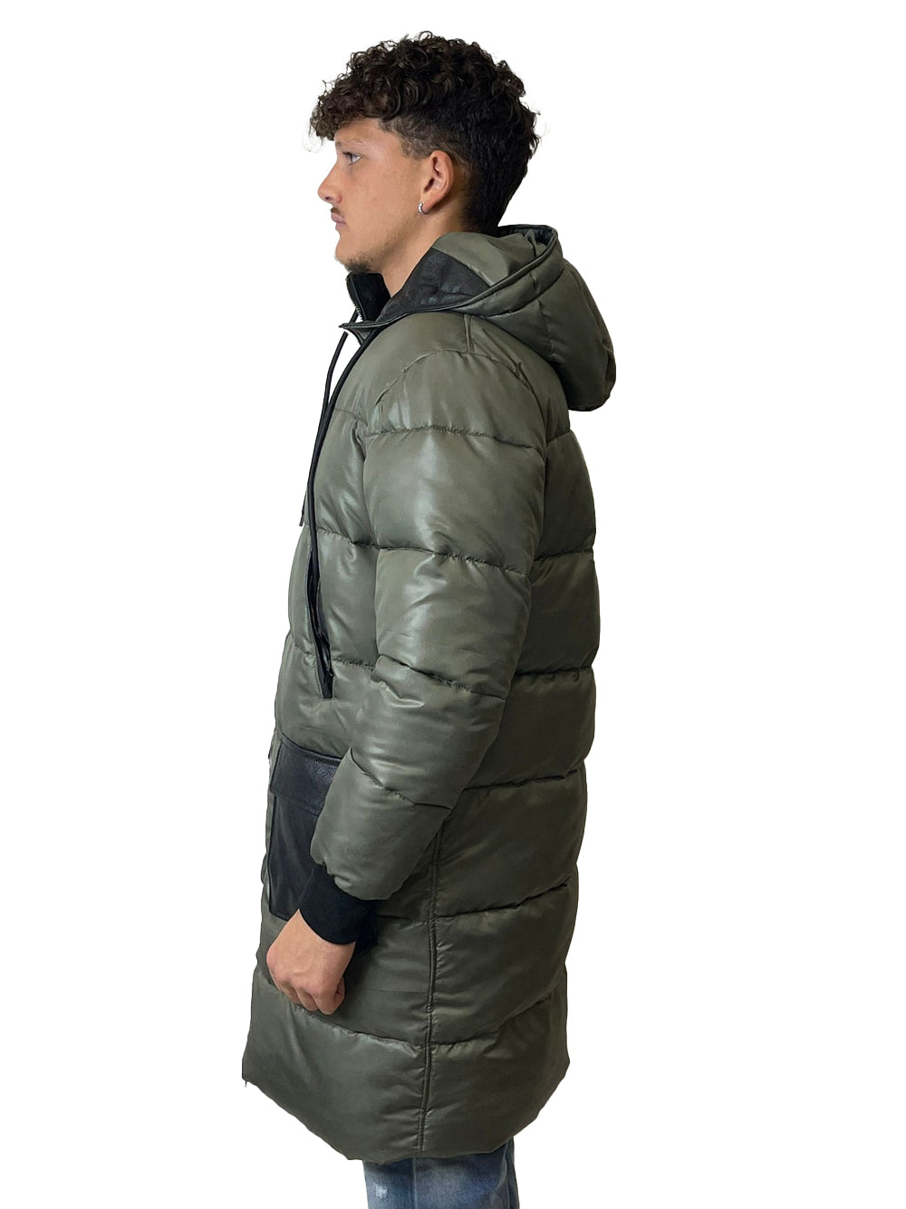 Piumino lungo con cappuccio e coulisse, chiusura zip. Dettagli in pelle. Tasconi sul fronte.